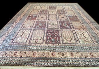 Bei diesem Teppich handelt es sich um einen sogenannten "Gartenteppich" oder "Felderteppich", im persischen und unter Kennern auch als "Cheschti" bezeichnet. Die Musterung von Gartenteppichen stellt aufwendige Gartenanlagen aus der Vogelperspektive dar. Die ältesten Gartenteppiche stammen aus dem 16. Jahrhundert, Vorbild war der sagenhafte Teppich "Frühling des Khosrow" des Sassanidenkönigs. Die Teppiche sind in Felder eingeteilt, meist von Wassergräben durchzogen. In den Schnittpunkten befinden sich häufig Bassins, in denen manchmal auch Springbrunnen wiedergegeben werden. Die Gräben (in denen oft Fische und Enten schwimmen) sind von Büschen und Blumen flankiert. Insgesamt sind Gartenteppiche ein Ausdruck der besonderen Liebe der Perser zur floralen Schönheit, die in fantastisch angelegten Gärten gipfelte.